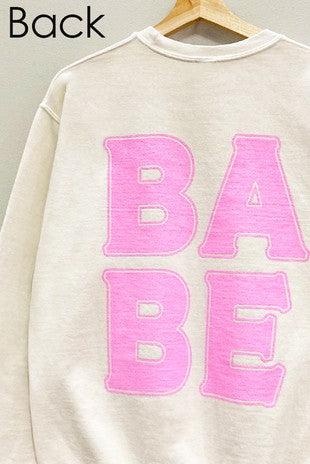 LONG SLEEVE GARMENT-DYED FRONT AND BACK PRINT "BABE" OVERSIZED GRAPHIC SWEATSHIRT