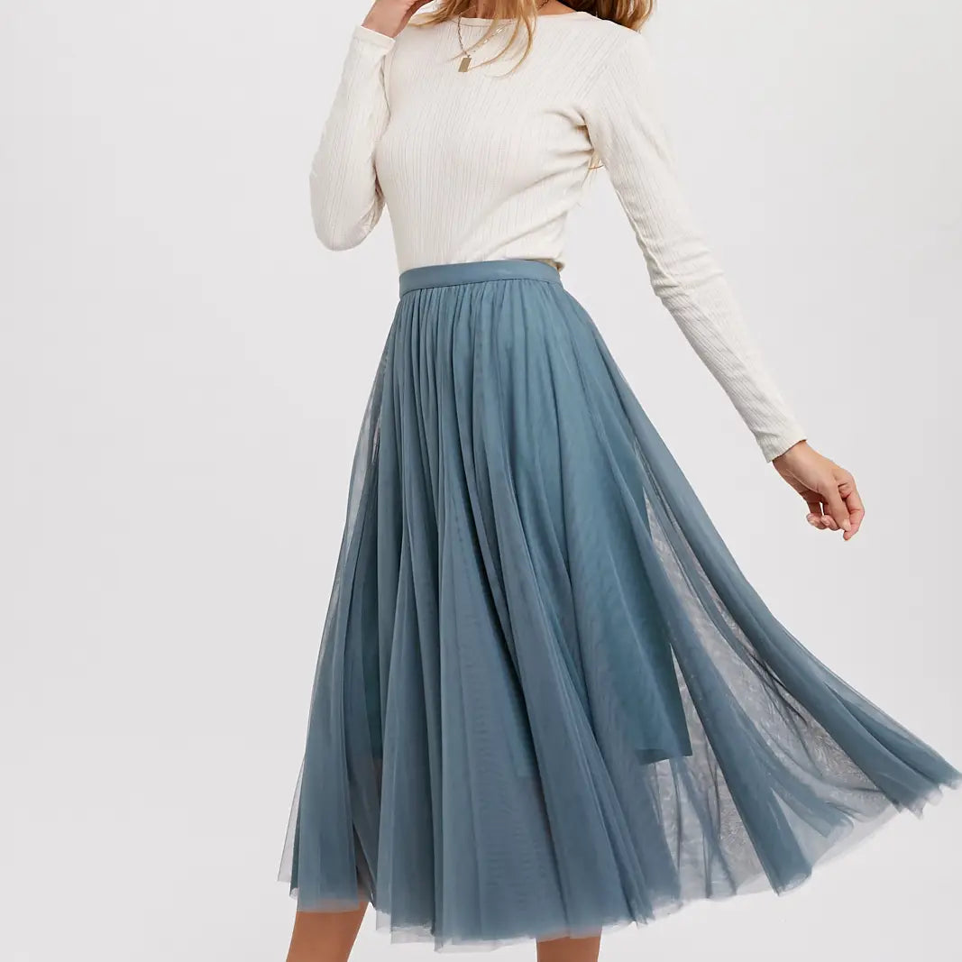A tulle skirt featuring a gathered construction, elasticized waistband, and A-line silhouette, partially lined. -Model is 5'9" and wearing a Small