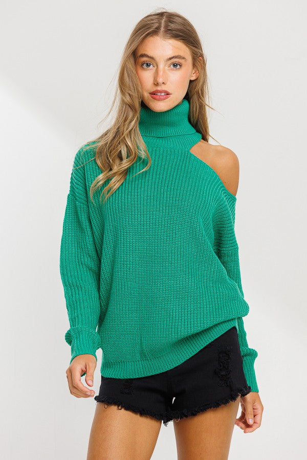 Details* -Crochet waist length -Turtle neck sweater -One shoulder cut out detail -Loose silhouette *Model info* Wearing a small size -Height:5'8 -Bust:32B -Waist:26 -Hip:36